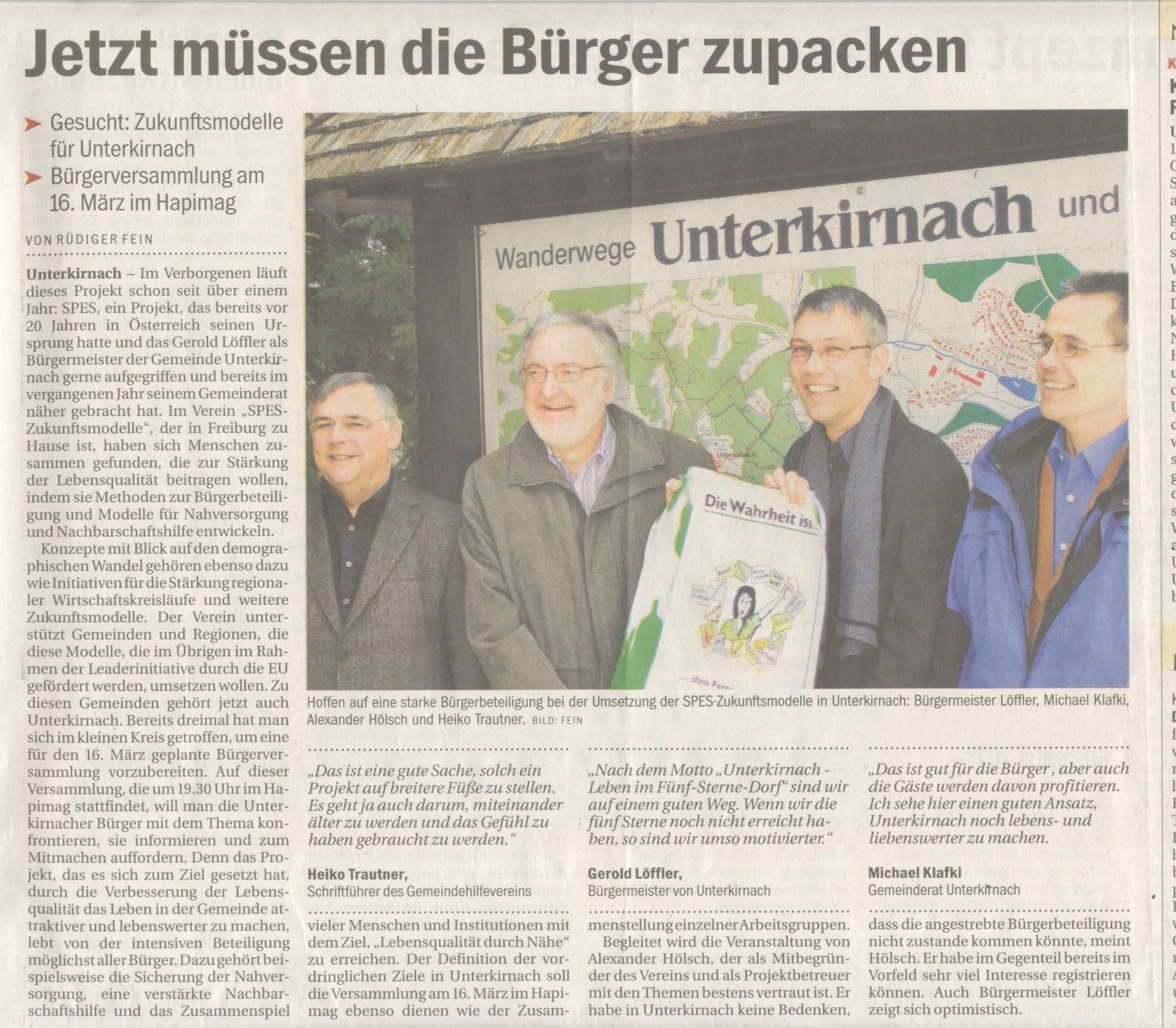 Der Verein unterstützt Gemeinden und Regionen, die diese Modelle, die im Übrigen im Rahmen der Leaderinitiative durch die EU gefördert werden, umsetzen wollen. Zu diesen Gemeinden gehört jetzt auch Unterkirnach. Bereits dreimal hat man sich im kleinen Kreis getroffen, um eine für den 16. März geplante Bürgerversammlung vorzubereiten. Auf dieser Versammlung, die um 19.30 Uhr im Hapimag stattfindet, will man die Unterkirnacher Bürger mit dem Thema konfrontieren, sie informieren und zum Mitmachen auffordern. Denn das Projekt, das es sich zum Ziel gesetzt hat, durch die Verbesserung der Lebensqualität das Leben in der Gemeinde attraktiver und lebenswerter zu machen, lebt von der intensiven Beteiligung möglichst aller Bürger. Dazu gehört beispielsweise die Sicherung der Nahversorgung, eine verstärkte Nachbarschaftshilfe und das Zusammenspiel vieler Menschen und Institutionen mit dem Ziel, „Lebensqualität durch Nähe“ zu erreichen. Der Definition der vordringlichen Ziele in Unterkirnach soll die Versammlung am 16. März im Hapimag ebenso dienen wie der Zusammenstellung einzelner Arbeitsgruppen.