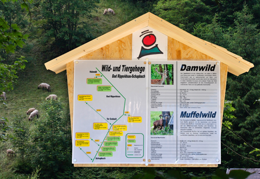 Bei der Gestaltung der Holztafeln mit kleinem Schindeldach stand Zimmermann Bernhard Hermann, Bruder von Arbeitskreismitglied Erich Hermann, mit Rat und Tat zur Seite. Es ist geplant, auf diese Holztafeln nun je eine Übersichtskarte mit Angaben zu Standort und eine Karte mit der Beschreibung des jeweiligen Tiergeheges anzubringen. Die sehr gelungene Gestaltung von Übersichtskarte und Gehegebeschreibung mit Bild und detaillierten Erläuterungen zu den jeweiligen Tieren hat Hans Dieter Roth übernommen. Als kleines Bonbon: Zu jedem Gehege gibt es die genaue GPS Position.