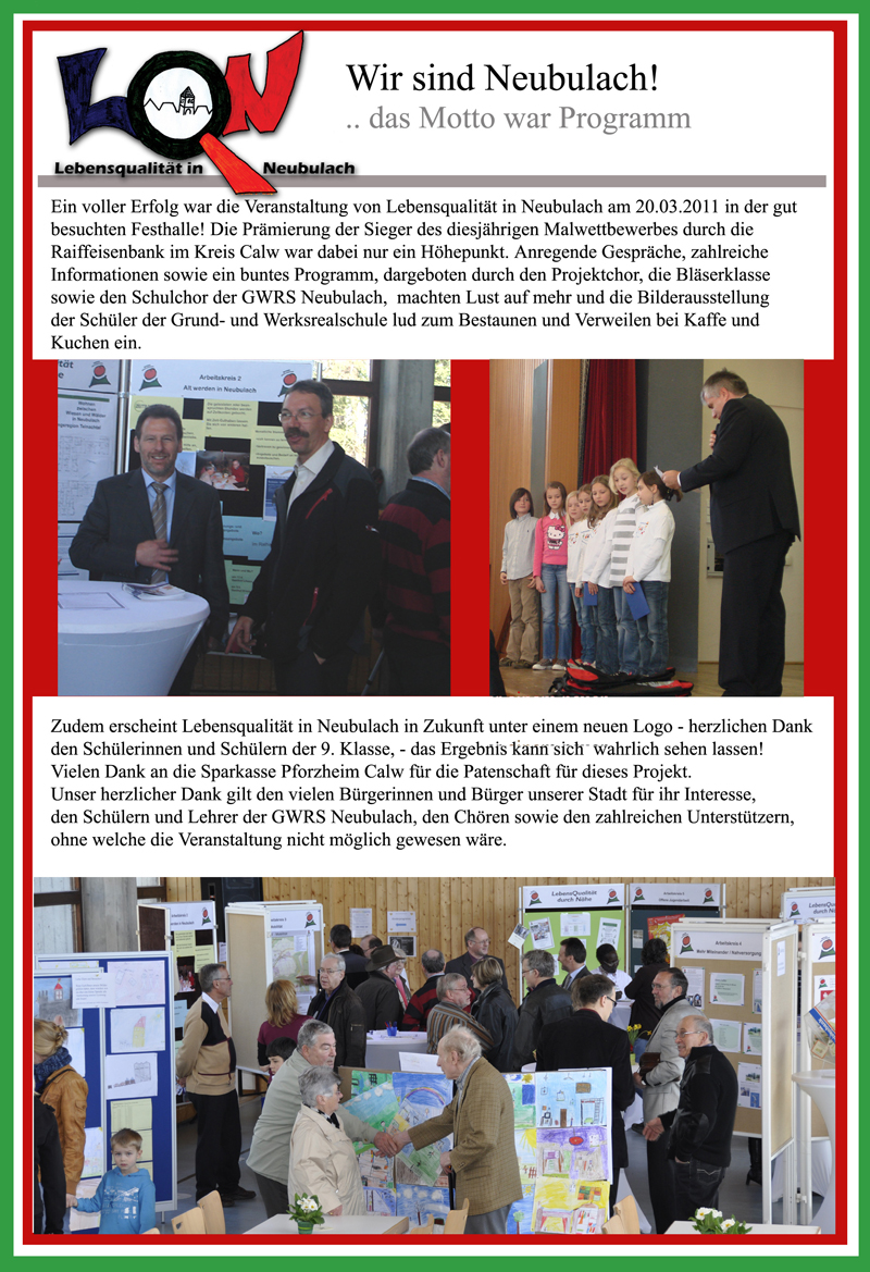 Darüberhinaus soll LQN-Neubulach ein eigenes Gesicht bekommenund dazu haben die Schüler und Schülerinnen der 9. Klasse Logos entwickelt, Der beste Entwurf wurde an diesem Tage als das zukünftige LQN-Logo vorgestellt. Dieses Projekt wurde begleitet und unterstützt von der Sparkasse Pforzheim-Calw.