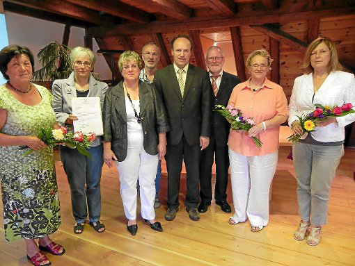 Nach der Übergabe des Bewilligungsbescheides für das Netzwerk "Helfende Hände Seewald": (von links) Maria Hensler, Henriette Girrbach, Waltraud Nägele, Vereinsvorsitzender Burkhard Schmierer, Bürgermeister Gerhard Müller, stellvertretender Landrat Klaus-Ulrich Röber, Regierungspräsidentin Nicolette Kressl und Christa Berg vom Regierungspräsidium Karlsruhe Foto: Blaich Foto: Schwarzwälder-Bote